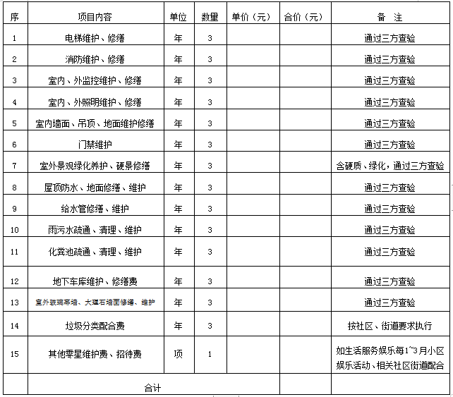 5、电梯维保、消防设施、绿化维护、环境卫生、保安秩序、设备维护等模块分项测算见附件。服务中乙方在某分项目未能达到本合同相关要求的,甲方可随时收回该分项目的管理权,并将该项目预算的费用从乙方收取的物业费中扣除(酬金相比率扣除),甲方有权对该项目进行外包或自主管理。本服务合同中,乙方累计三项达不到服务合同中所约定的标准,甲方有权提前终止本服务合同,并不承担任何责任。