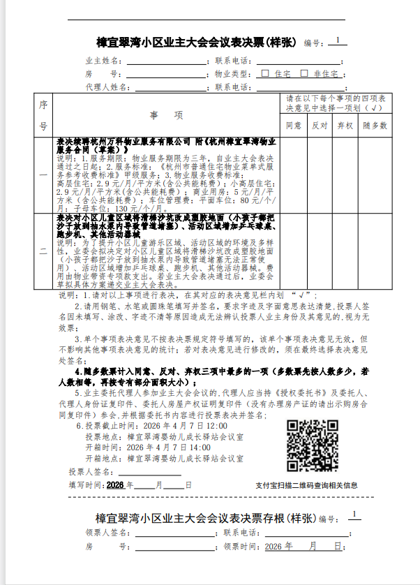 樟宜翠湾小区业主大会会议表决票(样张)