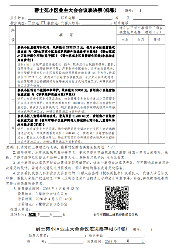 爵士苑小区业主大会会议表决票(样张)