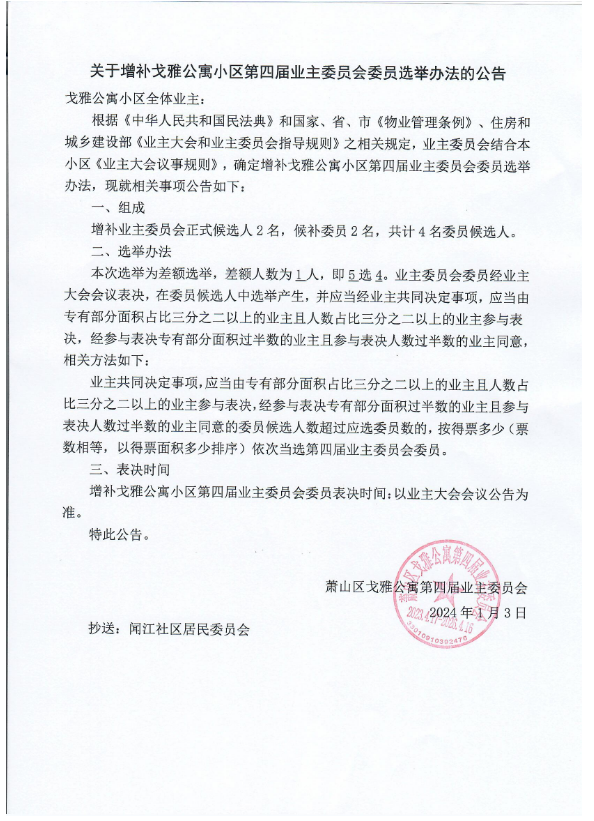 关于增补戈雅公寓小区第四届业主委员会委员选举办法的公告