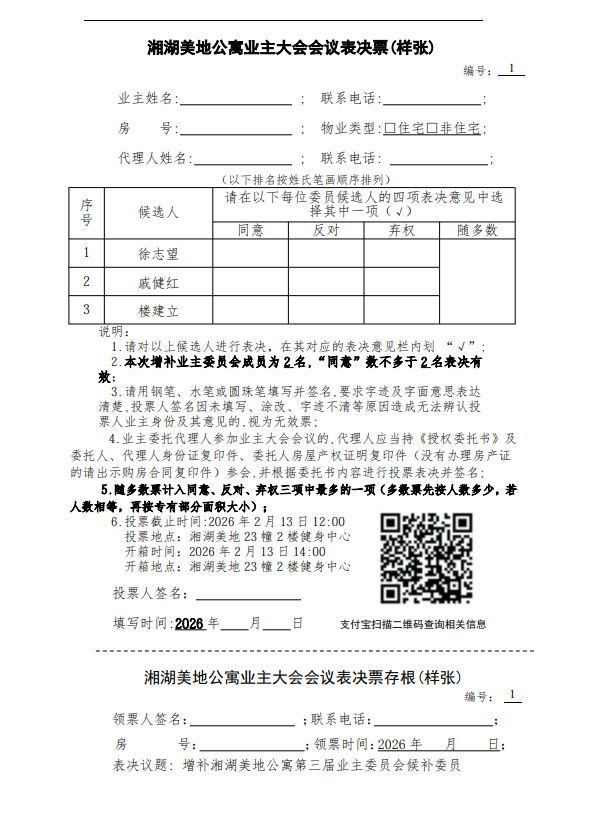 湘湖美地公寓业主大会会议表决票(样张)
