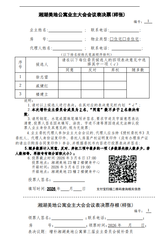 湘湖美地公寓业主大会会议表决票(样张)