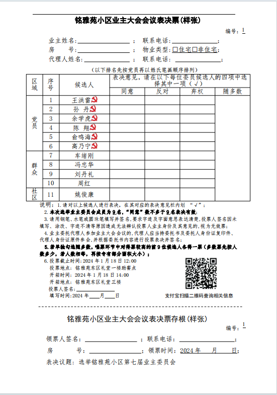 铭雅苑小区业主大会会议表决票(样张)候选人