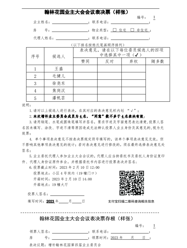 翰林花园业主大会会议表决票(样张)