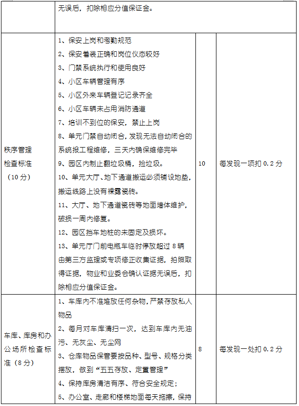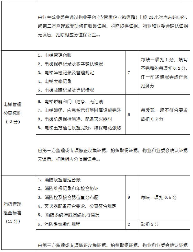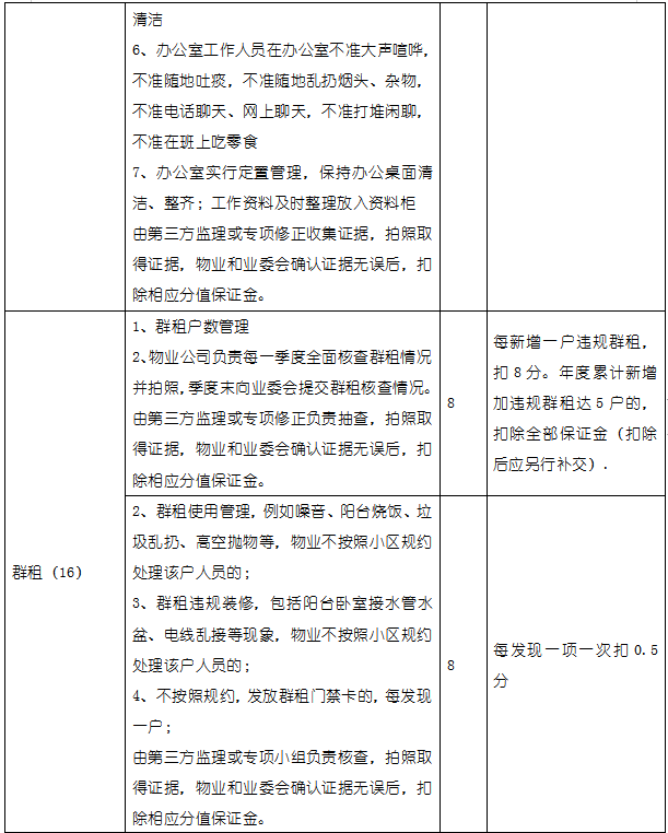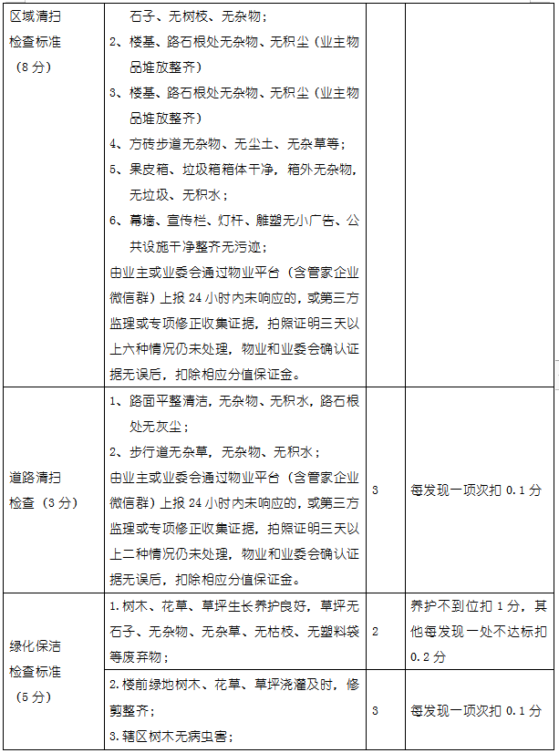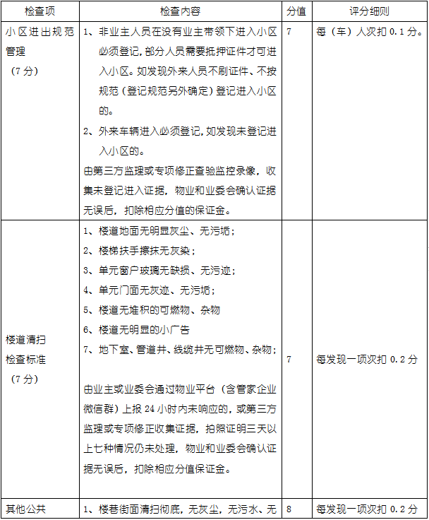 3、本表格没有列出项目但物业服务标准里有列的,套用类似条款进行扣分。