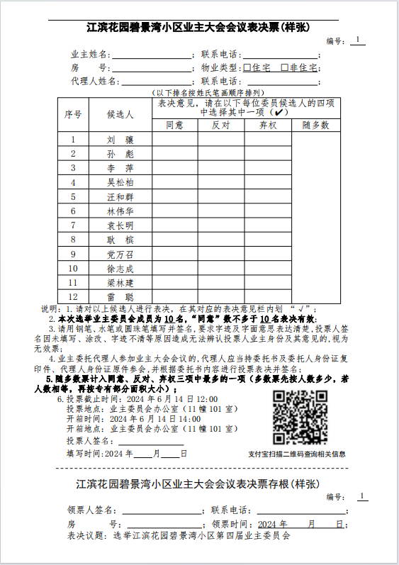 江滨花园碧景湾小区业主大会会议表决票(样张)