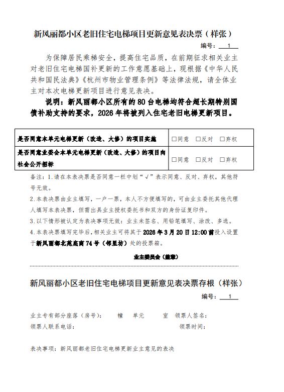 新风丽都小区老旧住宅电梯项目更新意见表决票(样张)