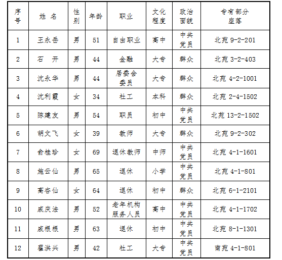 根据本届业主委员会委员候选人产生办法,在业主自愿报名的基础上,经业主委员会换届工作组审核,王家井社区监督,确认本次候选人符合要求,候选人12人名单公示如下: