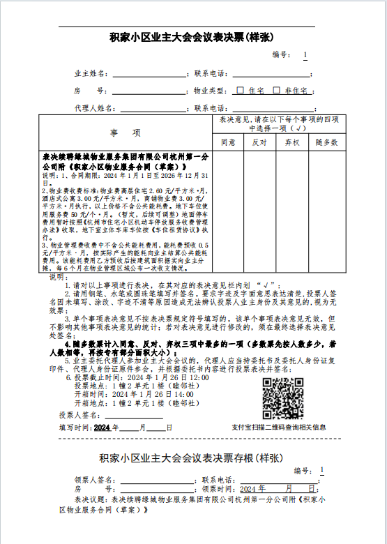 积家小区业主大会会议表决票(样张)