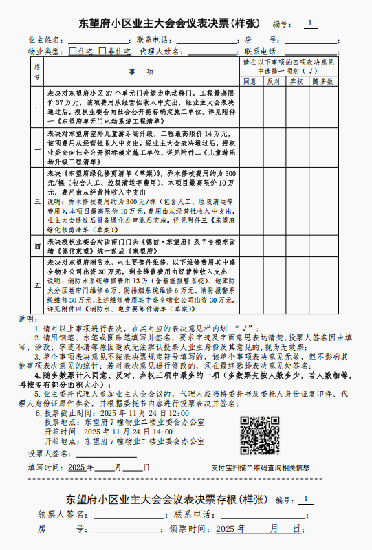 东望府小区业主大会会议表决票(样张)