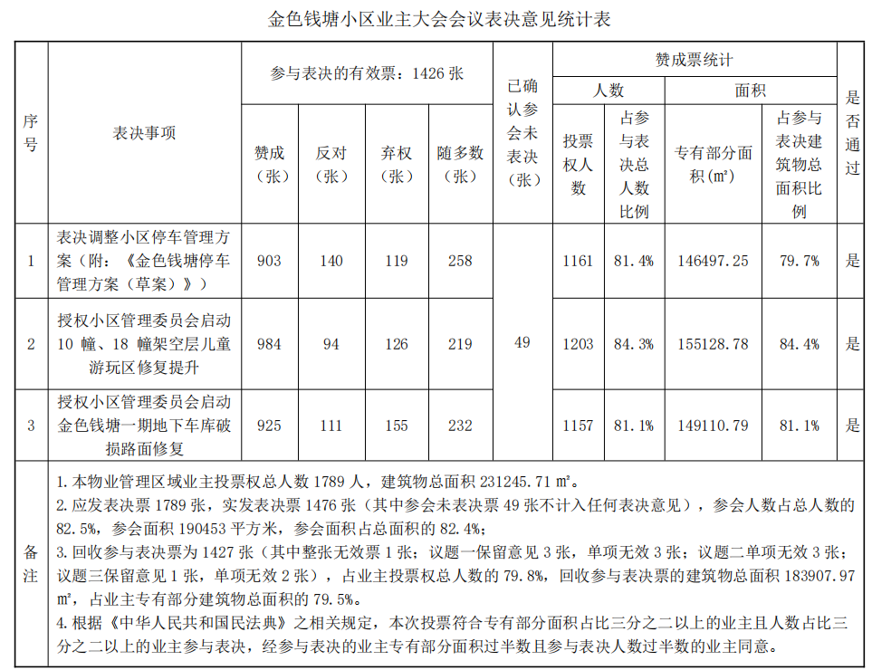 本物业管理区域业主大会会议于 2022 年 9 月 30 日至 2022 年 10 月 13 日在金色钱塘小区举行。会议就议题一:表决调整小区停车管理方案(附:《金色钱塘停车管理方案(草案)》);议题二:授权小区管理委员会启动 10 幢、18 幢架空层儿童游玩区修复提升;议题三:授权小区管理委员会启动金色钱塘一期地下车库破损路面修复事项进行了表决,金风社区对本次会议表决情况进行了监督,现就会议决定公告如下: