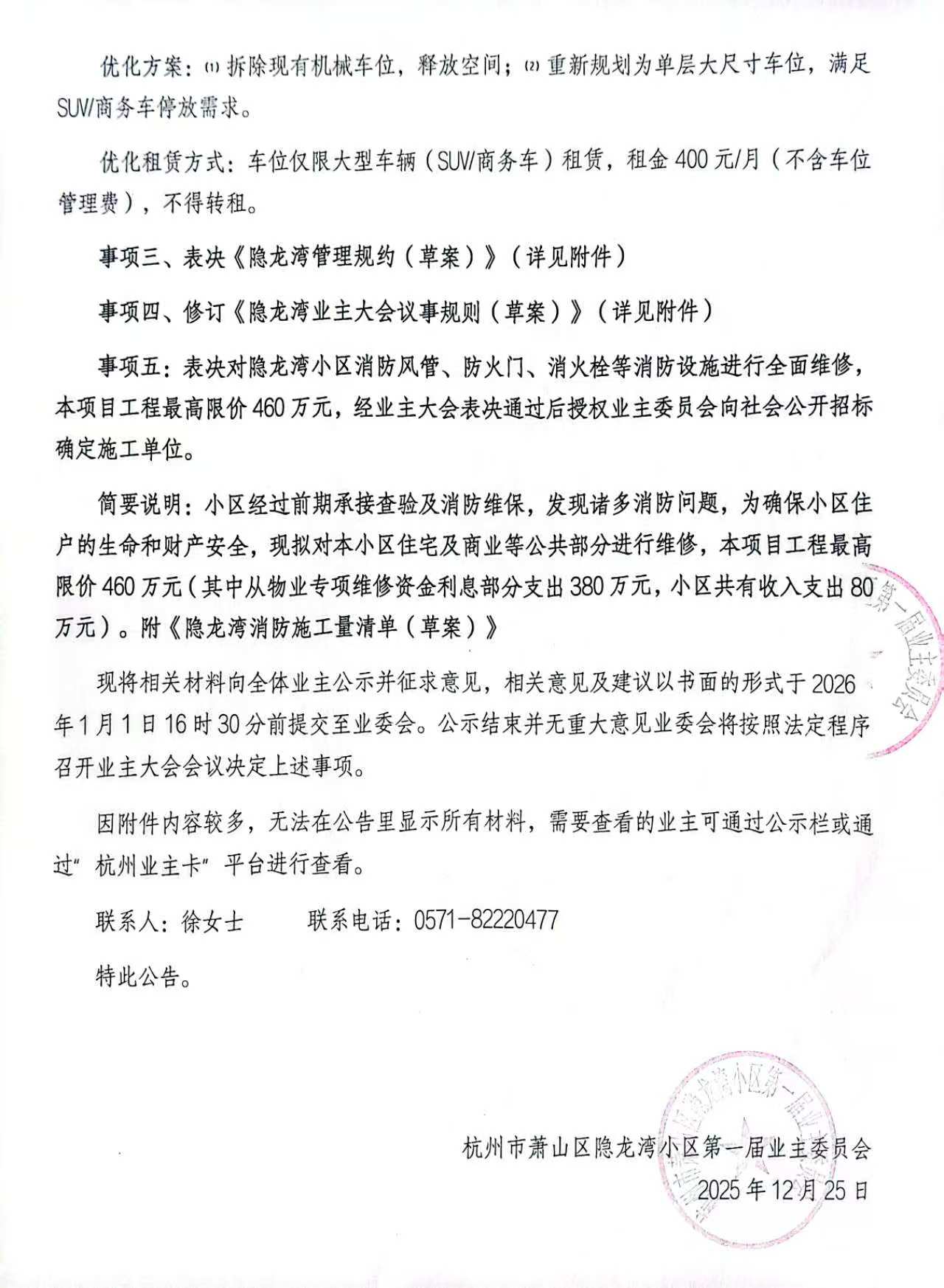 杭州市萧山区隐龙湾小区第一届业主委员会