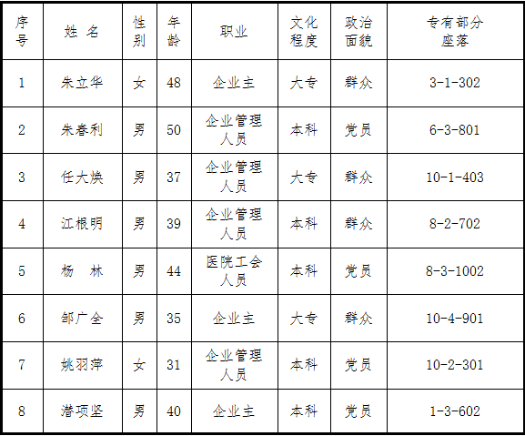 风华苑小区全体业主:根据本届业主委员会委员候选人产生办法,在业主自愿报名的基础上,经物业管理委员会审核,康城社区监督,确认本次候选人符合要求,候选人8人名单公示如下:(以下排名以姓氏笔画顺序排列)
