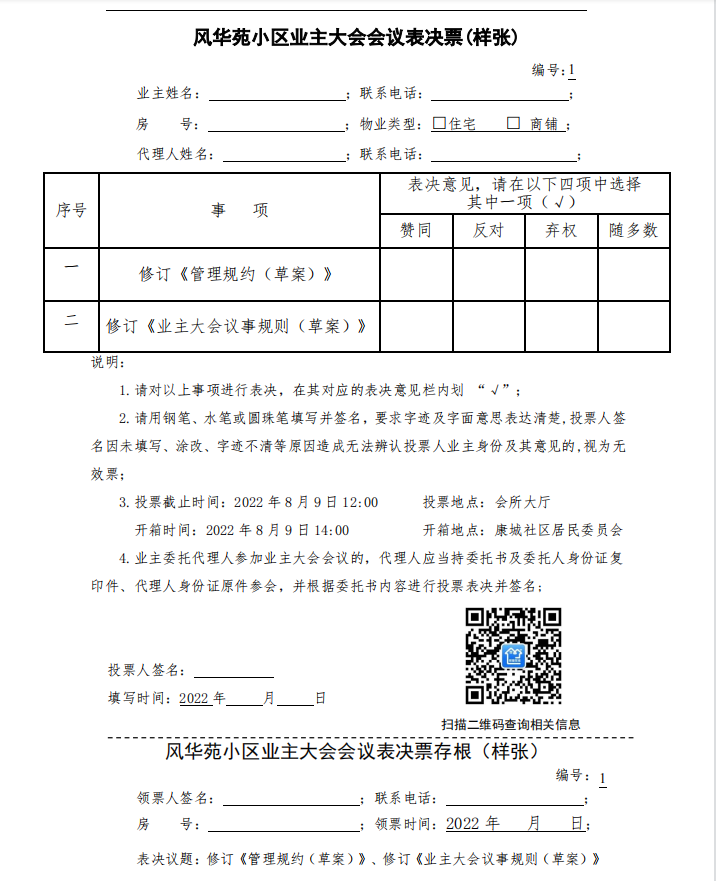 风华苑小区业主大会会议表决票(样张)