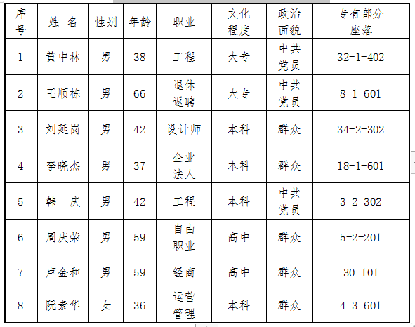 根据本届业主委员会委员候选人产生办法,在业主自愿报名的基础上,经杭州市紫荆家园物业管理委员会审核,紫荆家园社区与参与的业主共同监督,于2022年8月20日进行推选产生8位候选人,确认本次候选人符合要求,候选人8人名单公示如下: