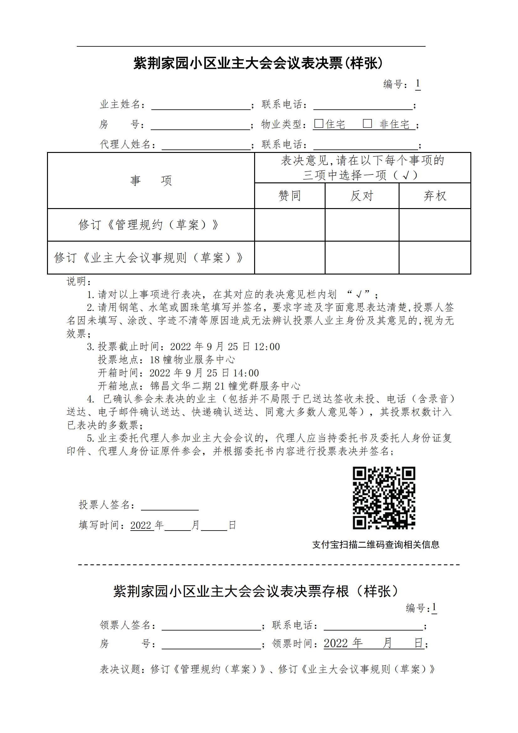 紫荆家园小区业主大会会议表决票(样张)