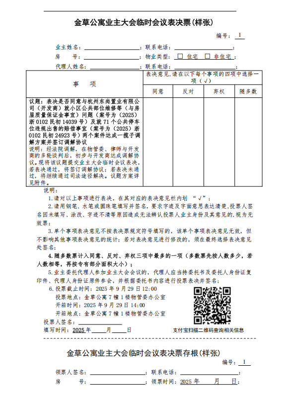 金草公寓业主大会临时会议表决票(样张)