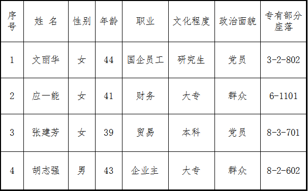 根据本届监督委员会委员候选人产生办法,在业主自愿报名的基础上,经物业管理委员会及上级部门资格审核,确认候选人符合要求,现候选人4人名单公示如下: