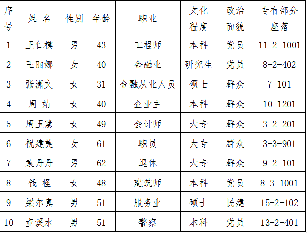 根据本届业主委员会委员候选人产生办法,在业主自愿报名的基础上,经物业管理委员会及上级部门资格审核,确认候选人符合要求,现候选人10人名单公示如下: