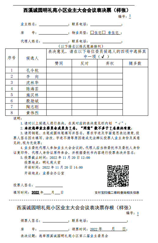西溪诚园明礼苑小区业主大会会议表决票(样张)