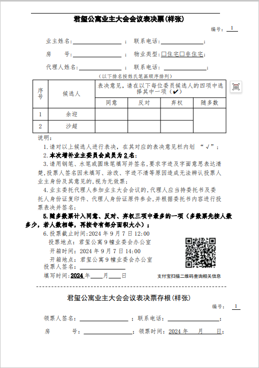 君玺公寓业主大会会议表决票(样张)