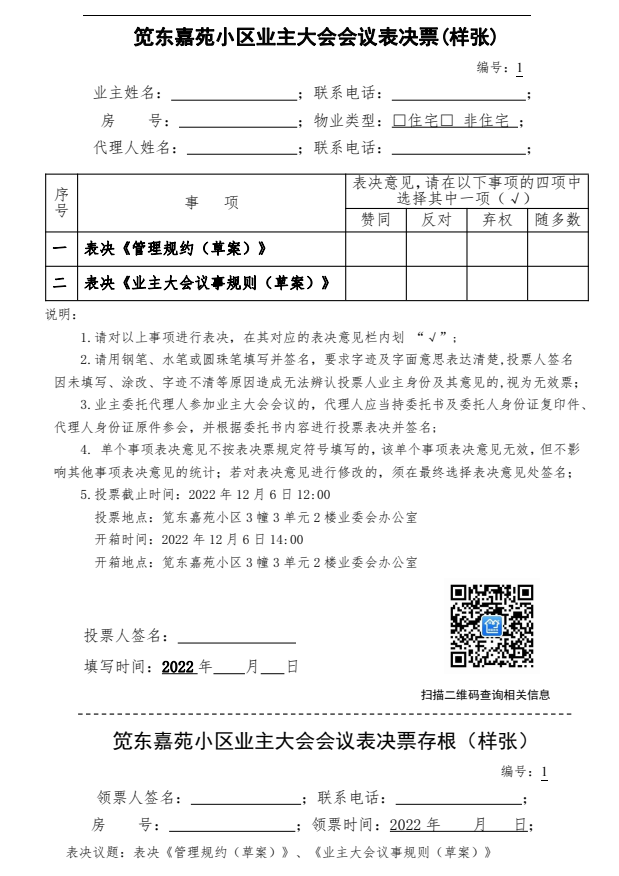 笕东嘉苑小区业主大会会议表决票(样张)