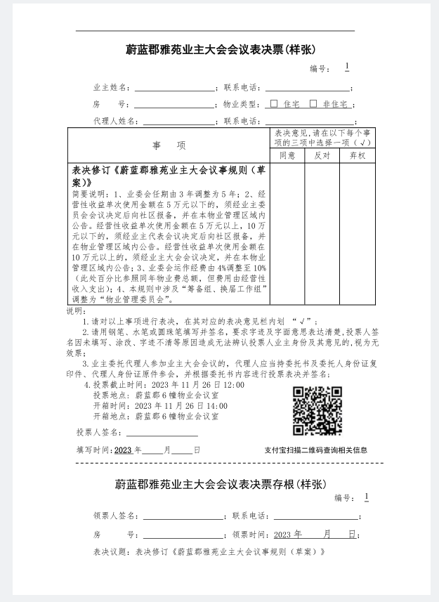 蔚蓝郡雅苑业主大会会议表决票(样张)