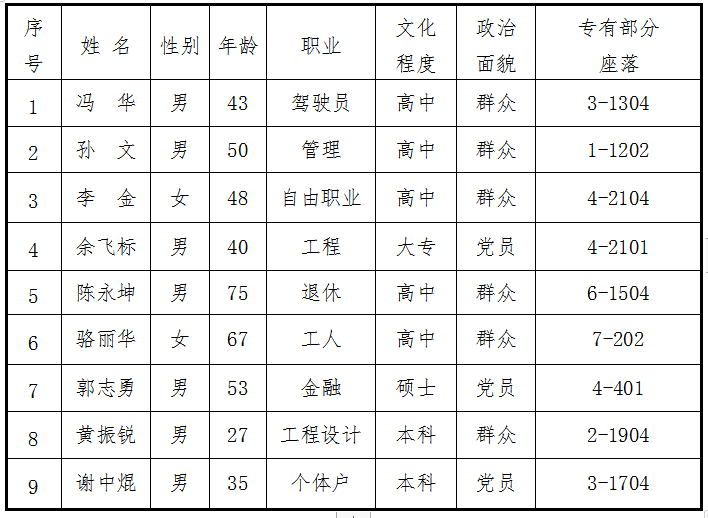 根据本届《业主委员会委员候选人产生办法》,在业主自愿报名的基础上,经明月桥社区党组织审核,确认本次候选人符合要求,候选人9人名单公告如下: