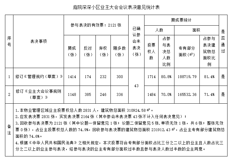 本物业管理区域业主大会会议于2021年12月17日至2021年12月31日在庭院深深小区举行。会议就议题一:修订《管理规约(草案)》;议题二:修订《业主大会议事规则(草案)》事项进行了表决,云轩社区对本次会议表决情况进行了监督,现就会议决定公告如下: