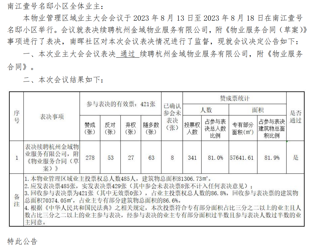 关于南江壹号名邸小区业主大会会议决议的公告