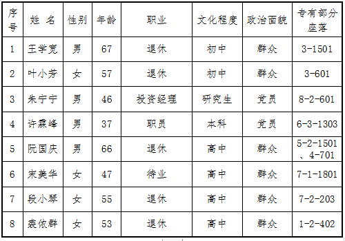 根据本届业主委员会委员候选人产生办法,在业主自愿报名的基础上,经北星社区党组织审核,确认本次候选人符合要求,正式候选人8人名单公告如下: