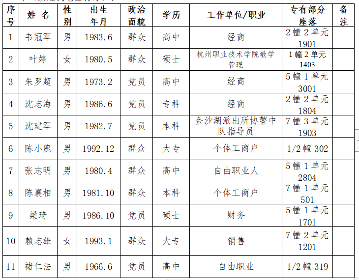 根据《杭州市物业管理条例》、《业主大会和业主委员会指导规则》、《茗轩小区业主大会议事规则》等相关规定及本届业主委员会委员候选人产生办法公告,在业主自愿报名的基础上,确认本次业主委员会初步候选人名单,现公示如下(按姓氏笔画排序):