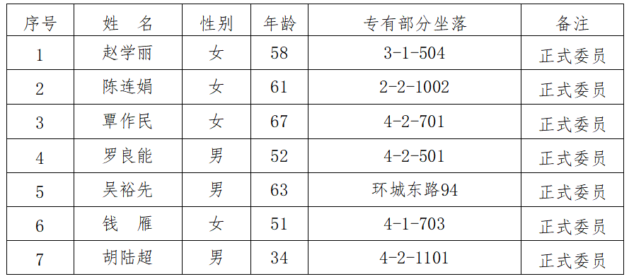 表决结果按得票高低选出7 名业主委员会成员,名单如下: